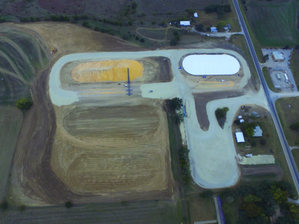 Two of the four planned temporary storage systems on an 81-acre site west of Concordia, KS serving as a spillover facility to the Concordia terminal LLC rail loading facility 1/4 mile to the east.