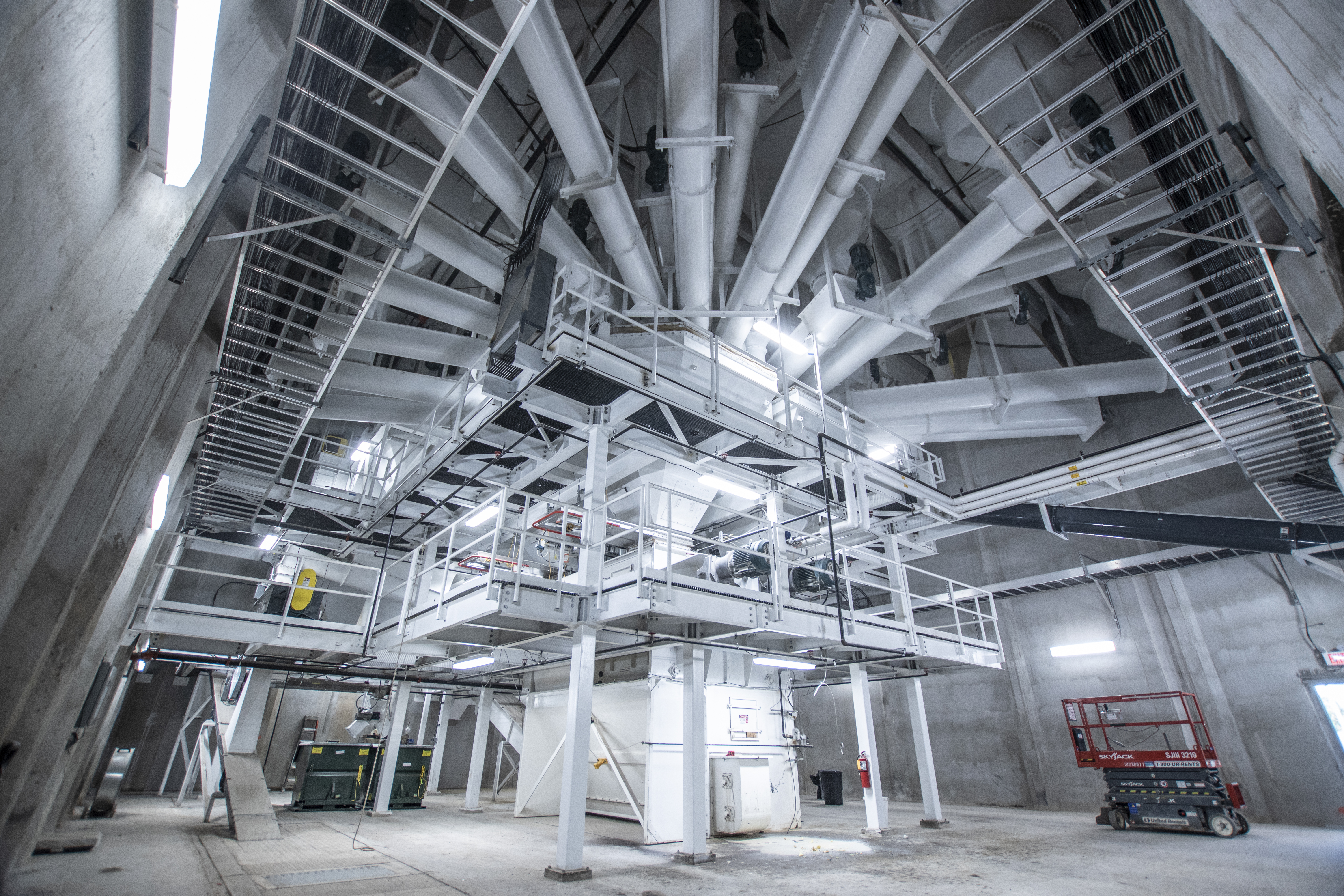 The main concrete structure of the mill includes 58 ingredient bins with a total capacity of 148,500 bushels and 34 loadout bins holding 55,770 bushels in total.