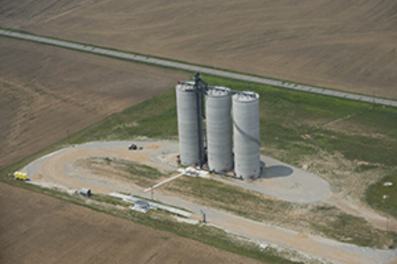 New 525,000-bushel grain elevator for Farmers Coop Equity Co. west of St. Leo, KS accepts wheat from farmers at the northern end of the cooperative’s trade territory. Aerial photo by Steven Brown, Wichita, KS.