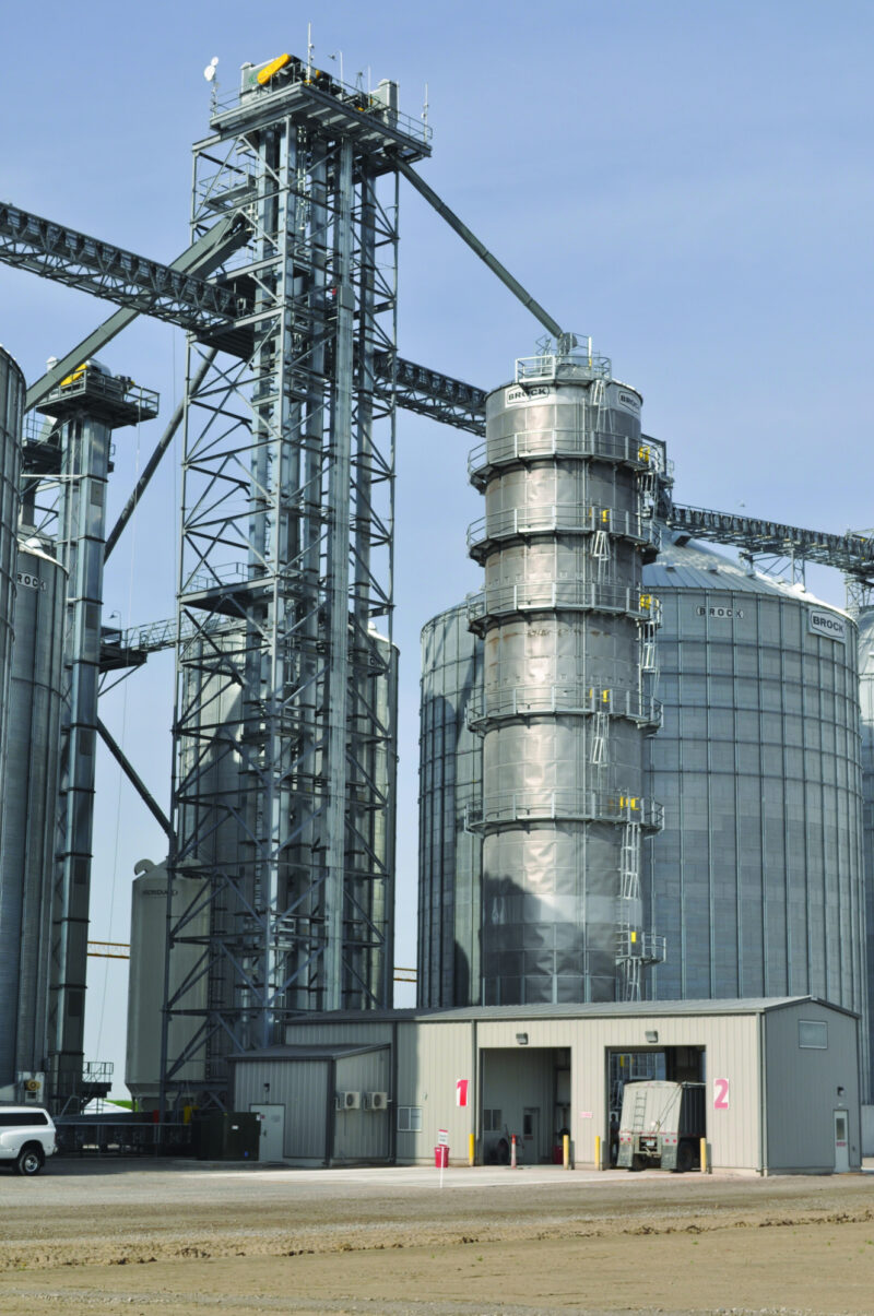 Grain storage at Delta includes 1.6 million bushels of upright Brock corrugated steel tanks and a 1.1-million-bushel LeMar center file temporary pile.