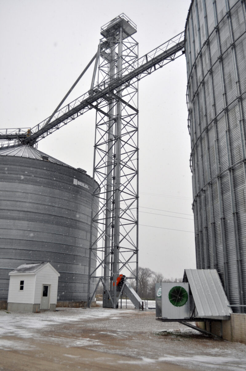 Aeration is supplied at 1/10 cfm per bushel by a pair of Sukup 20-hp centrifugal fans. The ducting leading from the fans into the tank are protected from snow and ice during Michigan’s frequently harsh winters by a metal structure resembling a steep, peaked roof.