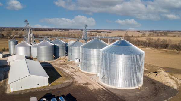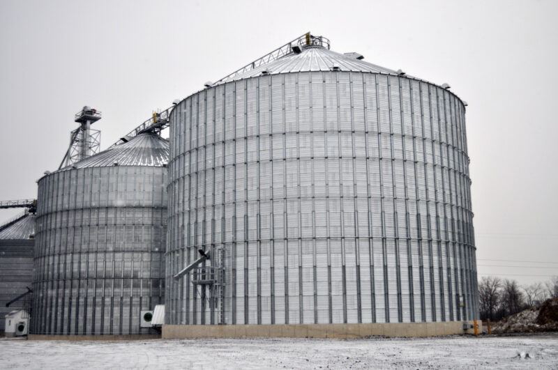 For the 2020 project, the newest Behlen tank stands roughly 98 feet in diameter and 63 feet tall at the eave. The flat-bottom tank is equipped with outside stiffeners, two sidedraw spouts, and a Daay bin paddle sweep. However, there are no grain temperature monitoring cables.