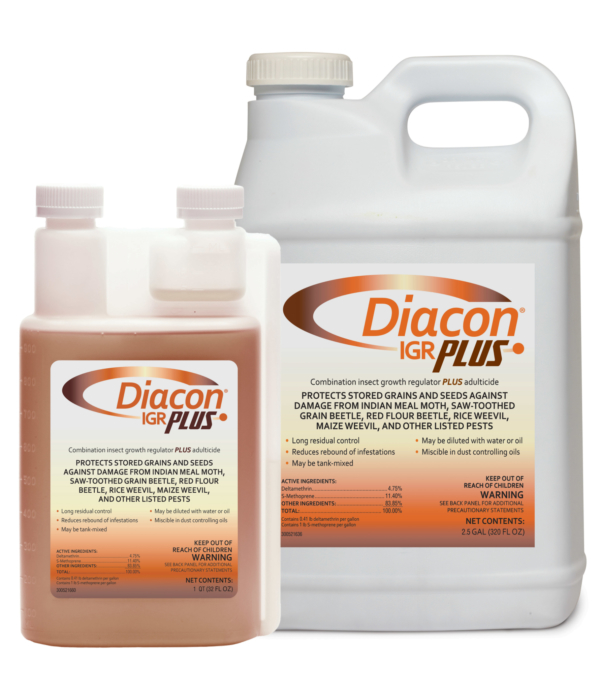“Diacon IGR Plus offers the convenience of two active ingredients in one product to control insects in both adult and larval stages,” says Stratinsky. “It can be used for pre-bin treatments and equipment and warehouse applications, directly on grain as it goes into storage, and perimeter treatments.”